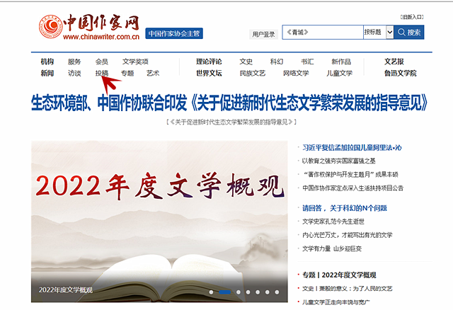 1、首先登录中国作家网//m.bafconsult.com/ 在首页顶端频道分类位置找到“投稿”(标红色箭头处),点击进入原创频道。