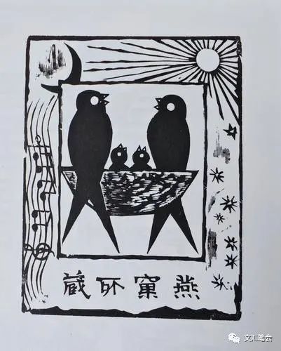 他给黄裳刻的那枚藏书票,上穷碧落下黄泉,都没有找到。我只能等待奇迹的出现,几年过去了,日子平平淡淡,奇迹仍然未见。黄先生似乎开始有意地总结一生的劳绩,多次提到要开一个别开生面的百岁画展。2021年冬,“入木——黄永玉木刻展”来沪展出,他一辈子木刻的精华都在这里,面对四百多块木板,他曾感慨:“这一堆的骸骨啊。”我在场中欣赏着不同时期的木刻,大概在后面的某个展厅,一枚小小的作品锁牢了我的目光。画面的中间站在燕窝上的两只硕大的燕子,相对而鸣,在它们中间是两只抬着头张着嘴的小燕子。环绕它们的是月亮、太阳、星星,最重要的是左端边缘,是流泻而下的五线谱。票面的下端,是 “燕窠所藏” 四个大字。——这不就是我苦苦寻找的那枚藏书票吗?我以为相见遥遥无期,不承想柳暗花明,再也没有比这样的意外相逢更让人高兴了。
