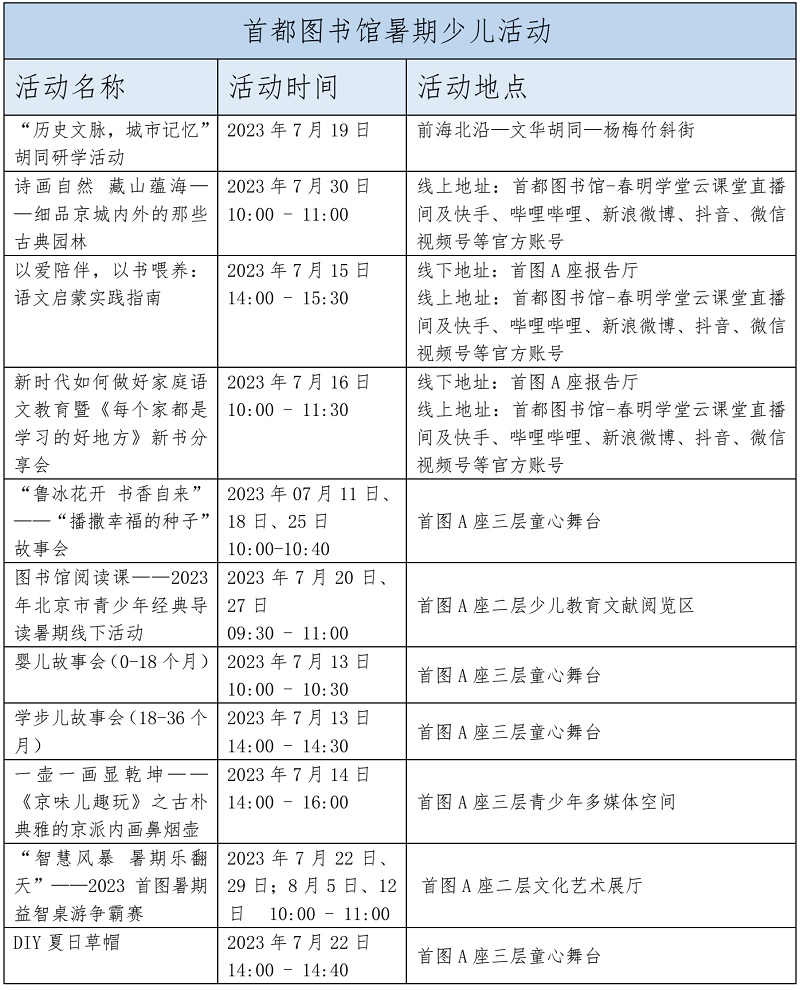 除少儿活动外,首图今夏还将继续开设“首图讲坛”系列活动、“牡丹亭传习”文本解读以及“全市诵读大赛”等活动。
