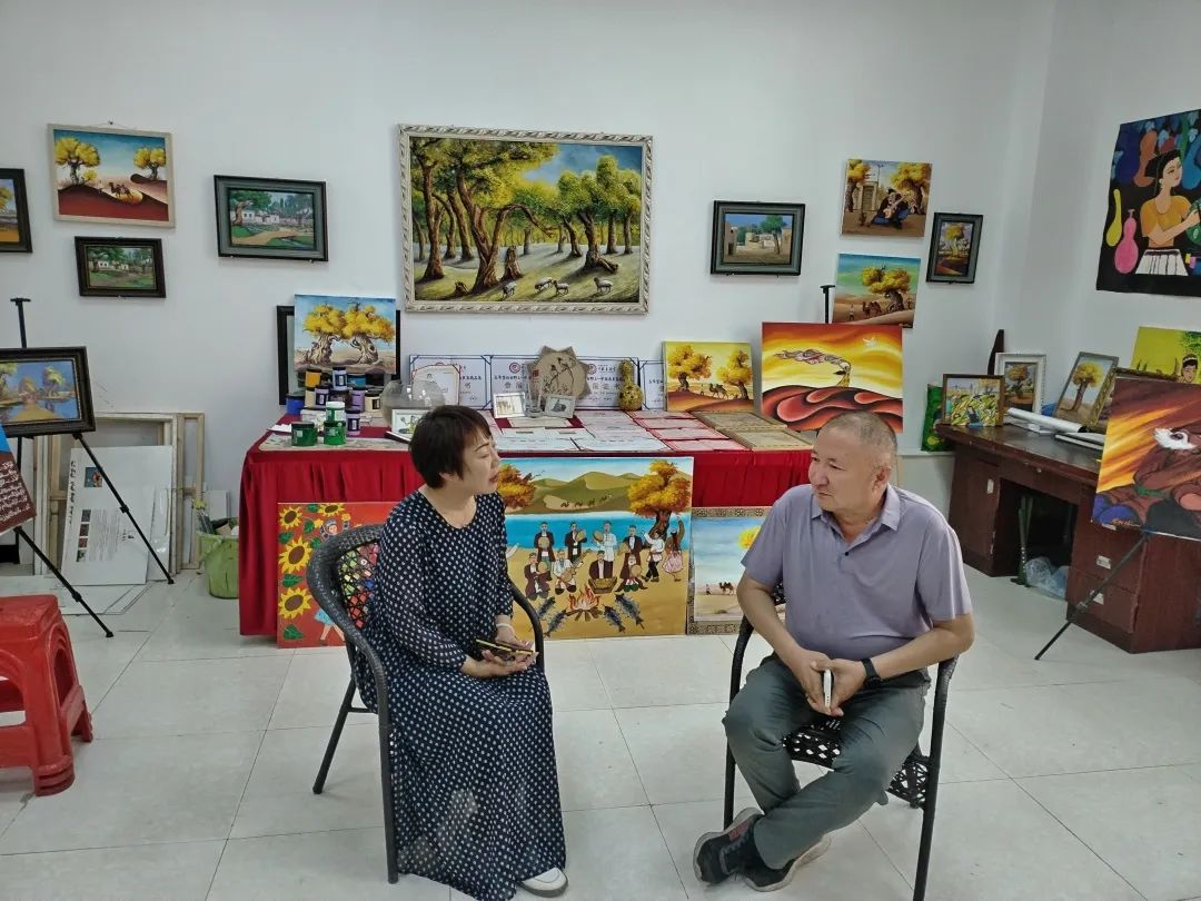 由新疆作家协会推荐选派的乌鲁木齐作家段蓉萍走进新疆喀什地区麦盖提县刀郎农民画乡,参观农民画展厅,采访农民画画家米娜瓦尔·木台力甫、西尔艾力·艾买提、木卡热甫江·艾海提等,深入了解了该县农民画起源,艺术特点,发展现状等情况。