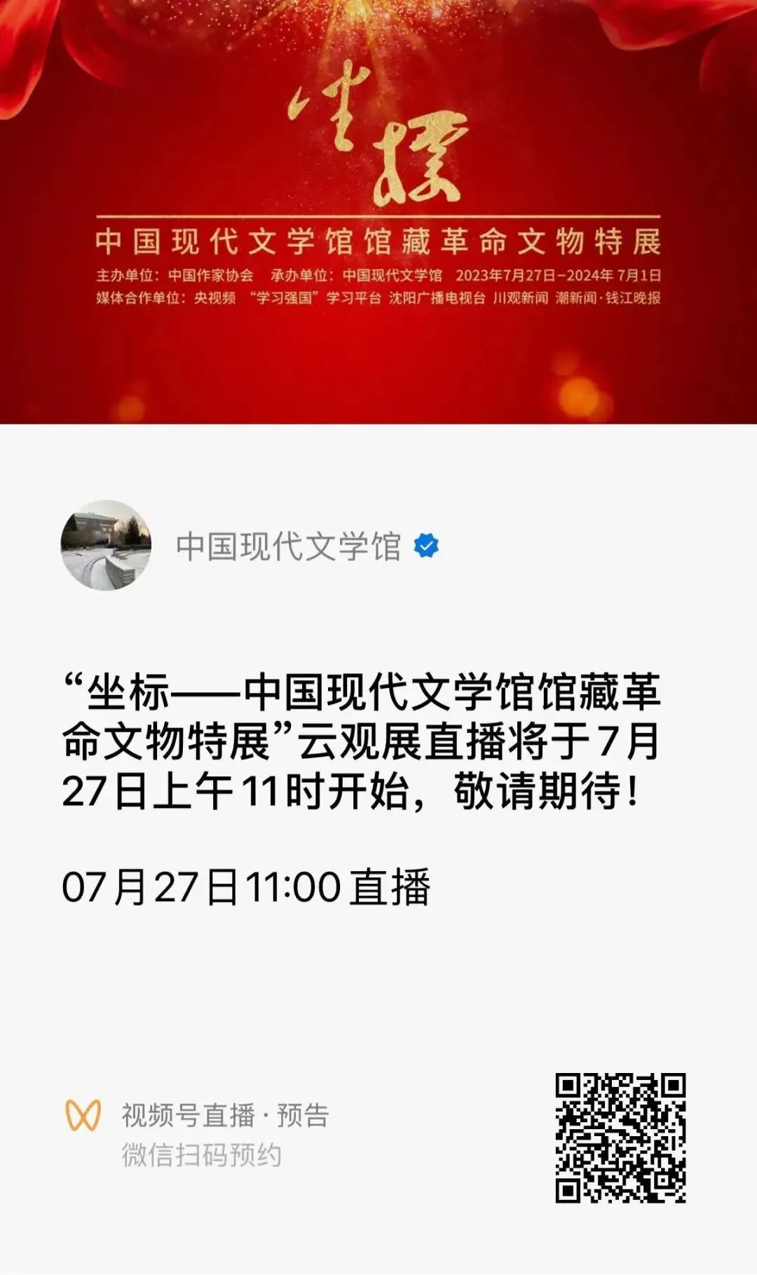 中国现代文学馆与央视频《品读》联合举办的探展直播将于7月27日上午11时正式开始,欢迎您观注中国现代文学馆微信视频号、官方抖音号、官方快手号,收看直播。