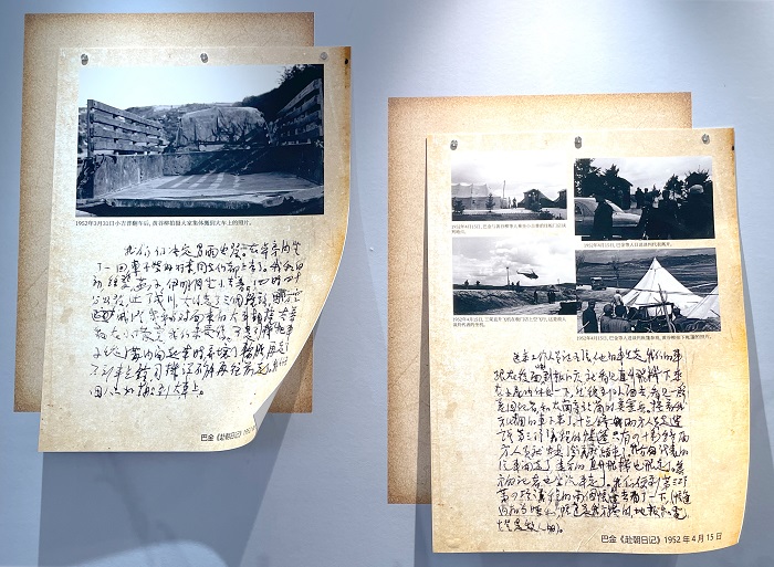 走至第五单元“我同祖国在一起”,一大面巨幅照片墙映入眼帘,这是作家黄谷柳拍摄的中国作家、艺术家赴朝慰问志愿军的写真集锦。黄谷柳曾两次赴朝,用手中的相机记录下朝鲜前线无数的感人瞬间。本单元精选了他在前线捕捉到的70个动人瞬间,引人回望壮阔的时代岁月和飒爽的英雄风姿。此外,李蕤、舒群的《赴朝日记》原件、家书,志愿军战士写给黄谷柳的书信,巴金怀念与黄谷柳共赴朝鲜的便笺等也在此单元展出。舒群的儿子李霄明特意带来了父亲的另一本日记原件,他表示,今年也是父亲诞辰110周年,父亲是一位爱国者和作家,他留下的日记正在整理中,不久将公开发表。这些日记真实记录了抗美援朝战争的严酷,非常有价值。