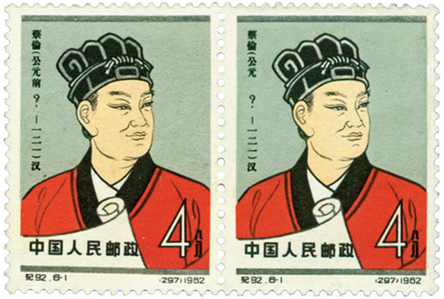 纪—92中国古代科学家(第二组)蔡伦邮票错版(左)与正版(右)