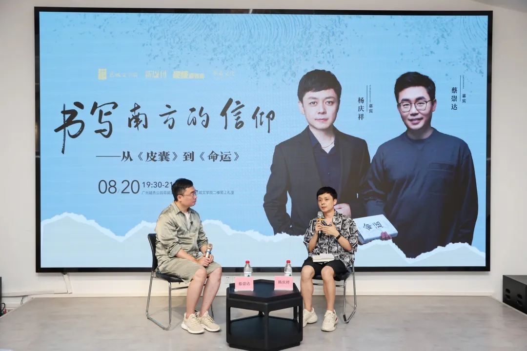 8月20日晚,“书写南方的信仰——从《皮囊》到《命运》”对谈分享活动在南国书香节分会场花城文学院举行。活动邀请花城文学院签约作家、“读懂中国”文学院执行院长蔡崇达与花城文学院签约评论家、中国人民大学文学院副院长杨庆祥展开对谈,由花城文学院主办,《新周刊》硬核读书会、果麦文化协办。