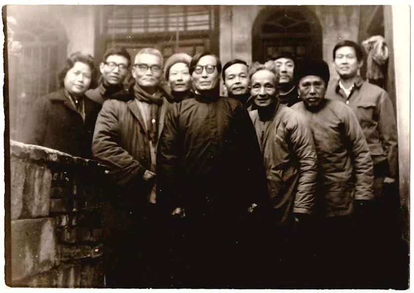 无名氏(左五)离开大陆前在杭州与好友合影留念,左三为画家丁天缺。