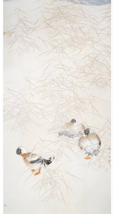 灵动。在绘画中特别是中国画中,这是一个被反复提及而使它部分地丧失了自身魅力的词,它需要“去蔽”,需要重新擦拭才能散发出原有的光,就像一个布满了锈迹的铜器——中国工笔花鸟,因由对色彩和技法的相当规约,因由对绘画“题材”和布局的强烈约范,并且,也因由我们过于深厚庞大的“传统”,而使得真正意义上的创新,真正意义上的灵性展现都变得艰难和可疑,绘画,特别是中国工笔花鸟,应当在文学之前更早也更显见地遭遇到布鲁姆所反复强调的“影响焦虑”。我们见到了太多的相互摹写,见到了太多的似曾相识,“灵动”在相对僵化的模式中越来越稀缺。刘树允却在僵硬、厚大的传统范式中伸出了自己的枝杈,呈现了个性趣味和灵动。他有意将中国工笔花鸟所注重的技术约规进行着突破,在传统中加入自己的理解和个性——中国绘画讲求笔墨、线条,在这点上树允并非弱项,但他没有在绘画中像同行那样“炫技”,而是有意淡化,使笔墨更多地符合于绘画内需,使它有了更深层的“贴”。工笔画强调分染,重彩,画面厚实却常常失于飘逸,树允先生的工笔着色较淡,他将飘逸从重彩中释放出来,更偏重于性灵。像他的《瑞雪》,寒鸭、枯苇和雪地的颜色极为接近,它需要审,需要品,其中的况味和寒意才得以呈现,然而这种淡中的深悠却具有难以挥拂的力量。和写意不同,工笔花鸟的构图因为笔墨和调色关系而相对较满,过多留白是困难的,是种冒险……然而刘树允的工笔花鸟却有意经营起空白,依靠自身的睿智和艺术灵性让空白变得丰富,深远,无中生有。《清音》,一只回首顾盼的鸟儿,占居着尺幅的一个较小位置,它微张的嘴中似乎有清音刚出,大片的空白,几片苇花……仅此。疏朗的构图,简洁的勾勒,没骨的草叶更增加了画面的清淡。在这清淡的背后,是一片可以想象的、有着更大空旷感的旷野,被简笔描绘出的“静寂”使鸟虫的清音更加传远,也使静寂更加静寂。另外,刘树允绘画的灵动还体现在他对物的描绘上,它们有生气,有温度,有血液的涌流和淡淡的心跳;刘树允绘画的灵动还表现在,他对绘画“意境”的审察与体味。像《清风瑞雪闲阳》(曾获第三届全国中国画展最高奖优秀奖),三只花鸭只占画幅的小部,且占中下的位置,大部分是淡彩勾勒的枯苇,白雪,疏朗有了,寒意有了,美感有了,但似乎还缺点什么,似乎有着某种意味没被说出,它意犹未尽……这幅画的妙就妙在,画幅左上那一小片以示冰河的灰蓝。它使得画面有了阔远,有了坚实厚重,有了尺幅外的延展,意与境全出。能想出在画面上添这一片灰蓝的人只能是天才。