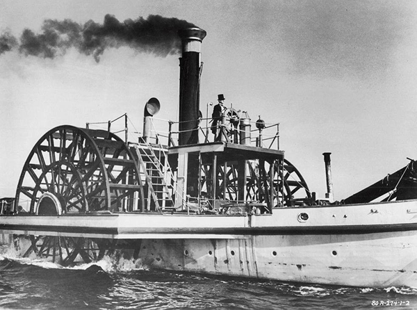 第二幅我想给大家展示的图,是凡尔纳的作品《八十天环游地球》里的一幅图。中国的著名作家鲁迅曾翻译过这部小说。我不知道在座各位有没有读过这本书,这个故事讲的是英国一位叫福格的绅士,他跟俱乐部里的朋友们打赌,在80天内可以环游地球一周,这在当时来说是现象级的速度。他来到了美国,他却在那里找不到一个可以保障能渡过大西洋到达彼岸的轮船。他就租了图片上看到的这个蒸汽机,他航行到大西洋中途的时候发现燃料用完了。福格是一个非常有钱的人,他就在海中央买了一条船,命所有人把这条船上可以燃烧的东西都扔进锅炉里面燃烧,这是一个自我燃烧的意向。那么在我的解读里面,这是对我们现代社会的一个隐喻,也就是我们将会把整个人类文明引向一个深渊。