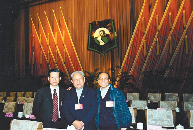 在中国作家协会第六次全国代表大会上的合影。从左至右依次为金炳华、袁鹰、束沛德。