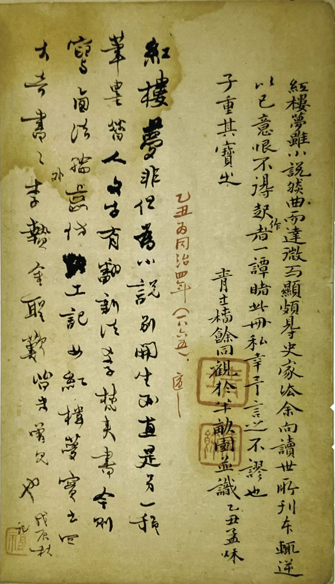 书后有许多题跋,其中一跋云:“红楼梦非但为小说别开生面,直是另一种笔墨……红楼梦实出四大奇书之外,李贽、金圣叹皆未曾见也。戊辰秋记”。钤印“福”。“福”即为原藏者刘铨福。胡适有眉批:大兴刘铨福,字子重,是北京藏书家。他最初跋此本在同治二年癸亥(1863),五月廿七日跋,当在同年。他最后跋在戊辰,为同治七年(1868)。刘铨福和父亲刘宽夫都是藏书家。叶昌炽在《藏书记事诗》有记:“河间君子馆砖馆,厂肆孙公园后园。月老新书紫云韵,长歌聊为续梅邨。”讲的就是刘氏父子的事。刘氏因得河间献王“君子馆砖”,名其居“君子馆砖馆”,又曰“砖袒斋”,所居即孙承泽故宅“园后园”。