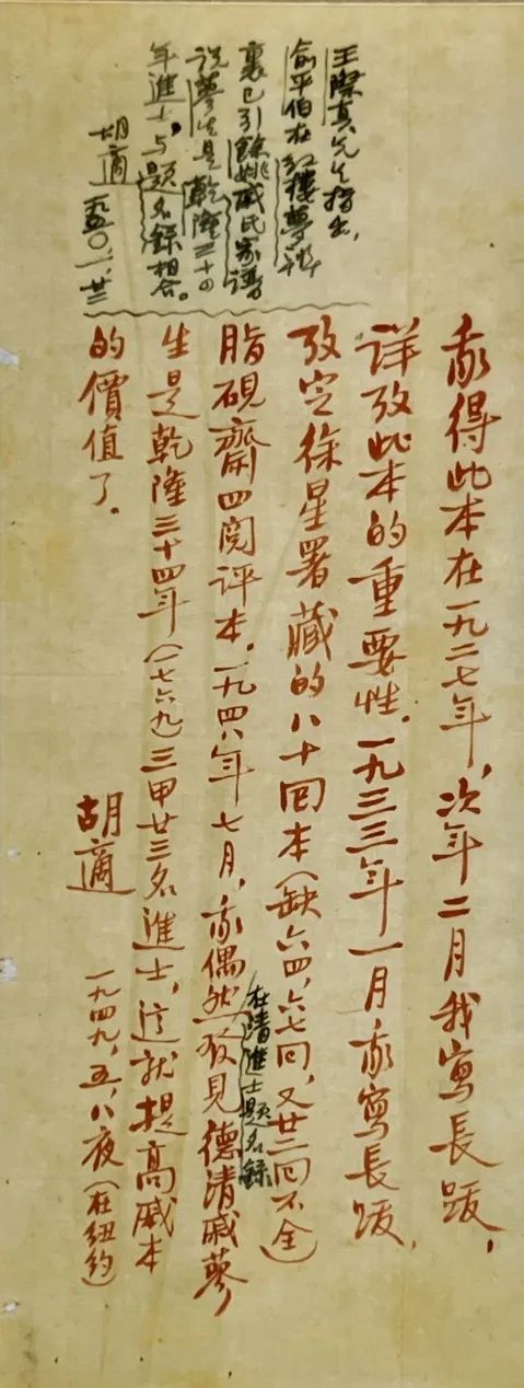 胡适去了美国,即把乾隆甲戌本《脂砚斋重评石头记》携去。从此,中国只有周汝昌传抄的副本。1950 年,美国哥伦比亚大学为乾隆甲戌本《脂砚斋重评石头记》做了三套显微影片。一套给哥伦比亚大学图书馆,一套赠给胡适,一套由胡适赠给翻译《红楼梦》的王际真。后来,胡适把自己保留的显微影片送给林语堂。