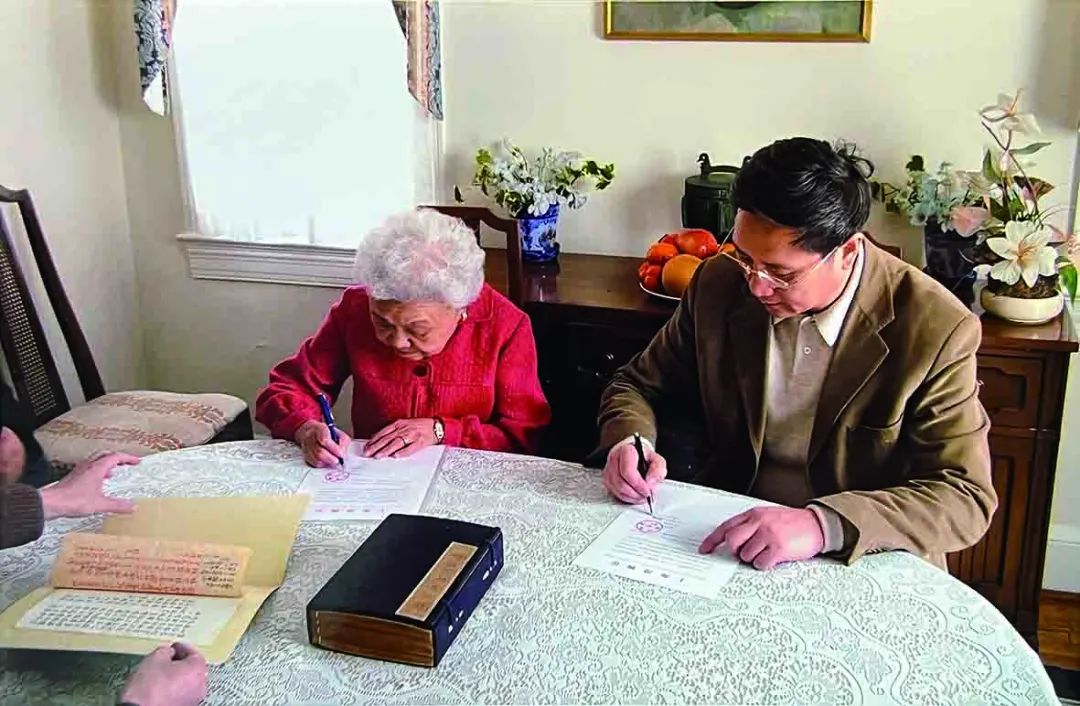顾祥虞、胡曾淑昭分别代表上海博物馆和胡适家属在《石头记》“甲戌本”出让协议书上签字(2005.2.21)