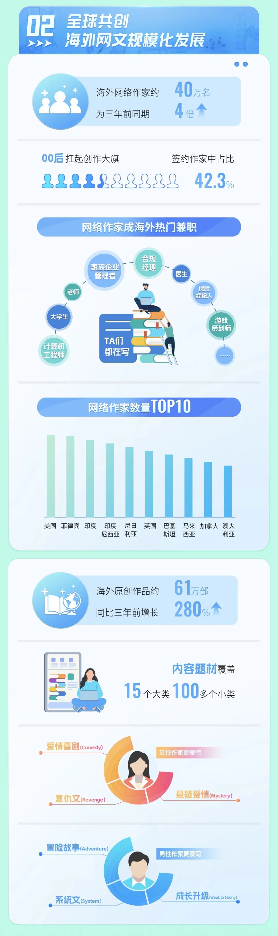 海外网络作家覆盖全球100多个国家和地区,其中,美国网络作家数量居于首位。起点国际的签约作家中,00后占比达到42.3%,已成长为创作中坚。网络作家的快速增长,带动海外网文呈现出百花齐放的原创生态。截至2023年10月,起点国际已上线海外原创作品约61万部,同比三年前增长280%。