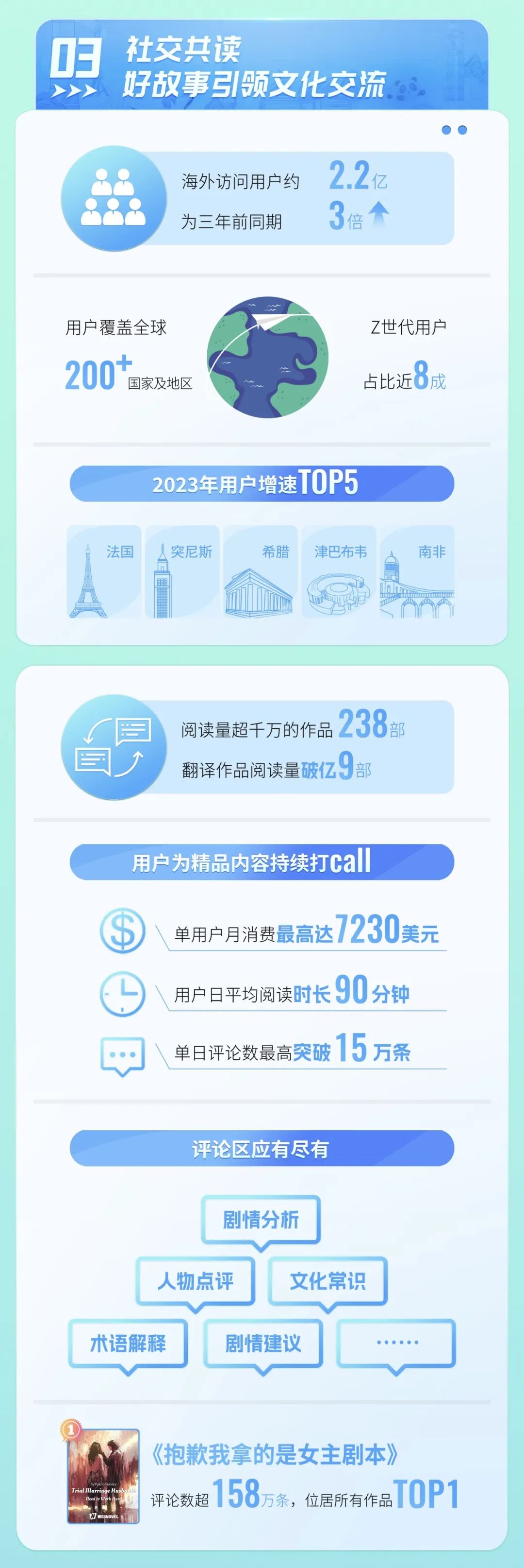 随着海外网文生态的日益成熟,在线阅读本身的诉求和年轻世代的网络社交习惯,让海外的读者们更愿意表达,也让围绕内容但又不限于内容的社交变得越来越频繁。截至2023年10月,起点国际的访问用户数突破2.2亿,为三年前同期3倍。这些用户来自全球200多个国家及地区,可谓“凡通网络处,皆有网文读者”。
