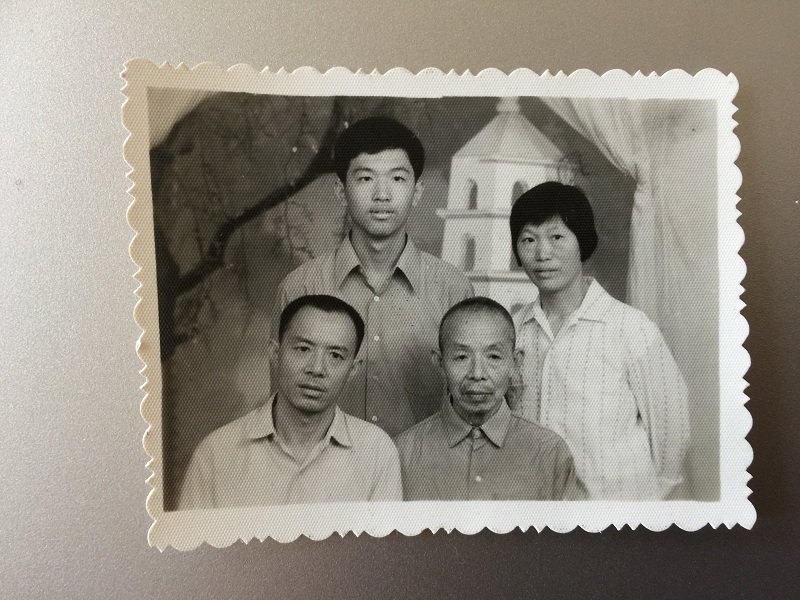 少年钟扬(后排左)与母亲王彩燕(后排右)、父亲钟美鸣(前排左)、爷爷钟先陸(前排右)合影)