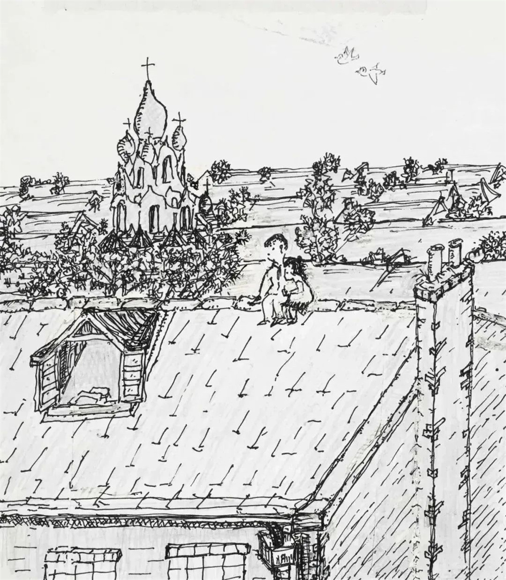 又一幅画,是十岁阿宝与六岁阿宝爬上屋顶。瓦片温热,黄浦江船鸣。沈宏非少时家住黄浦江边,听见黄浦江船鸣,与金爷心有戚戚焉。我儿时听的则是运河上船鸣,同样对圆号宽广的嗡嗡声有感怀。读画读书,皆是“心有戚戚焉”。