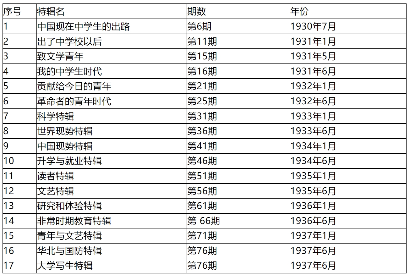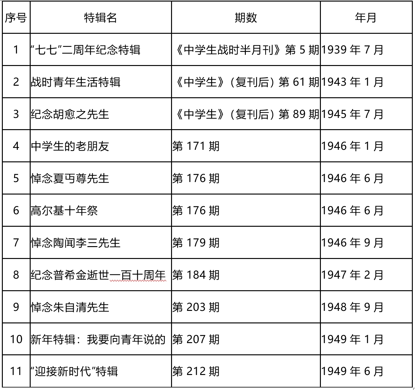 与1937—1949年的历史互为表里,《中学生》“特辑”如下: