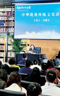 冯骥才“中华优秀传统文化”讲座结束时,在意犹未尽之中,“海河之子”李叔同填词的《送别》乐曲声响起,“长亭外,古道边,芳草碧连天……”在座的作家们纷纷轻声哼唱起来:“问君此去几时来,来时莫徘徊……”