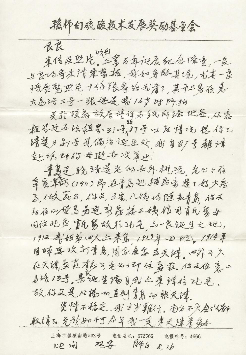 1991年夏,师白表伯曾在来信中说,他原计划要偕妻女北上看望舅母,并参加弢翁百年诞辰的纪念活动,还要和同窗挚友吴大任教授(著名数学家)同返南开中学。然而,由于“必须参加”一年一度的全国硫酸技术交流会而不得不作罢。