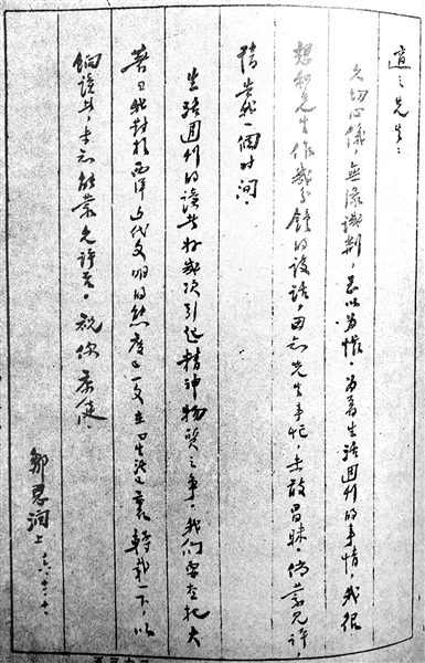 久切心仪,无缘识荆,至以为怅。为着《生活》周刊的事情,我很想和先生作几分钟的谈话。因知先生事忙,未敢冒昧。倘蒙见许,请告我一个时间。