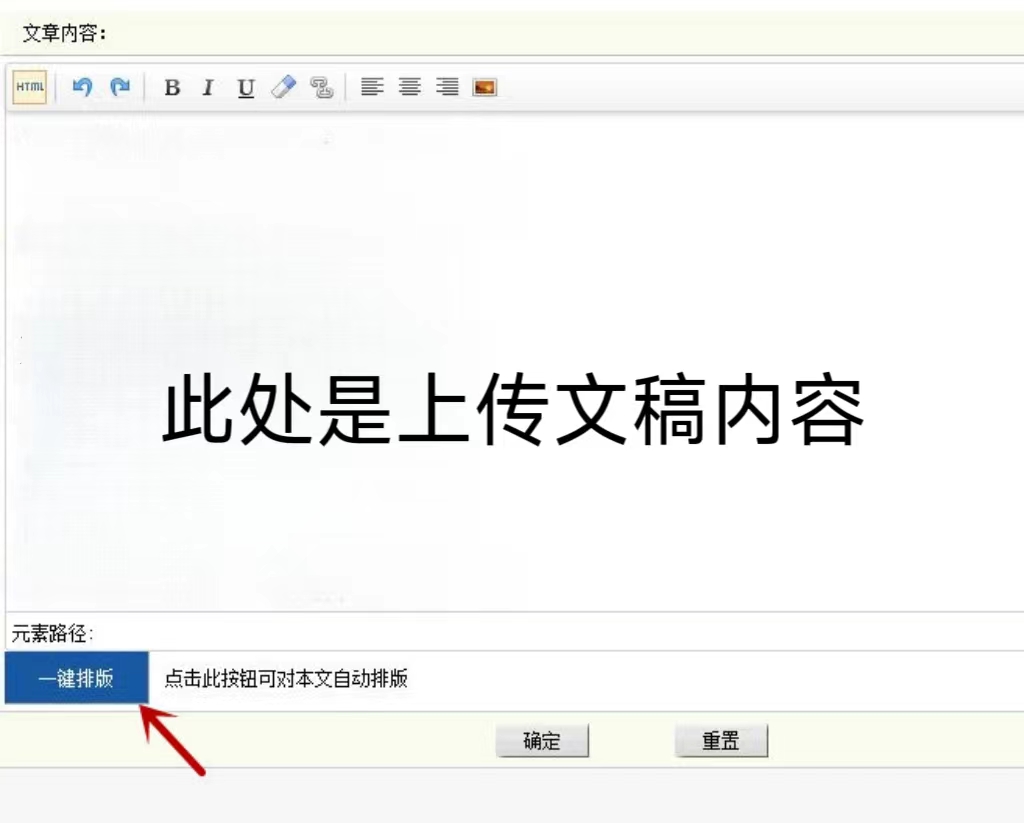 因原创投稿作品文档中包含来源不明的外网链接的情况时有发生,严重危害网络安全,为保障投稿、审稿工作顺利进行,我们郑重提示,自本公告发布之日起,所有投稿作品上传时请务必进行“一键排版”操作(相关按键如图中红色箭头指示)。此外,因诗歌格式特殊,进行“一键排版”操作后,请作者再根据具体情形调整分行排版。