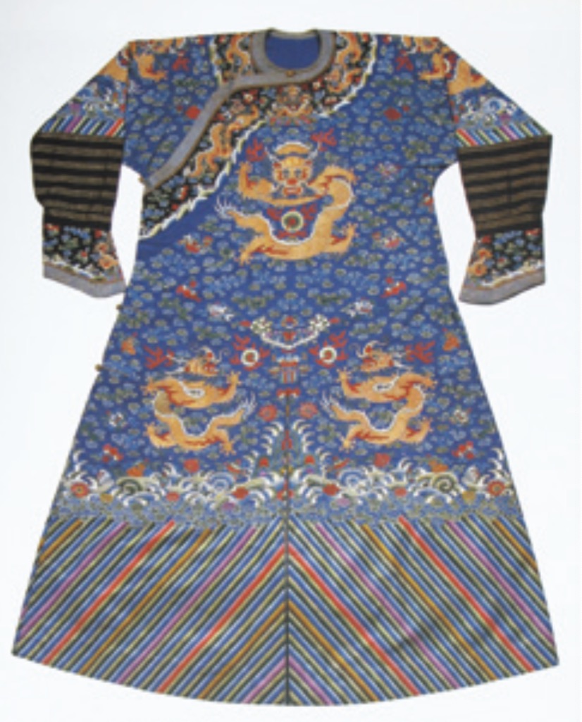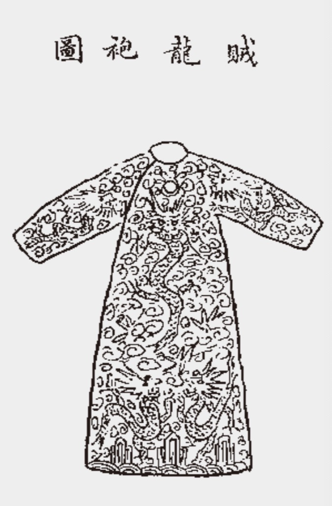 什么东西一用滥就得跌价。庶官杂流,甚至太监都穿上蟒服了,龙蟒之服也就不足以说明帝王身份了。延至清代,帝王为了自抬身价,只好朝着更高规格发展,他们把前代帝王仅仅用以祭祀天地的十二章衮冕扩充为一个衮服系列,所谓“龙袍”就是该系列之一,这大概也是帝王服装史上第一次正式使用“龙”来命名衮服。所谓龙袍(图2),除了传统十二章之外,至少还得“绣文金龙九”。(《清史稿·舆服志》)龙纹俨然成了衮服的标志,其余十一章,包括日、月、星辰,全都退居配角了。