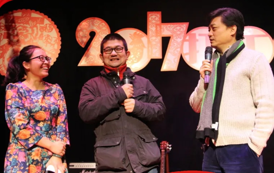 张慧瑜以文学小组志愿者身份参加打工春晚,主持人崔永元采访