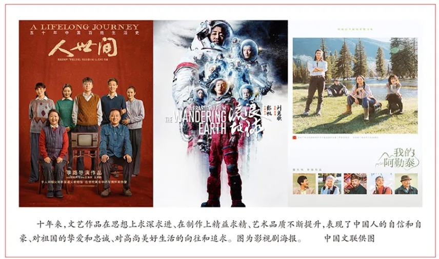 这是主旋律文艺作品在思想上求深求进、在制作上精益求精、艺术品质不断提升、表现亮眼的十年。电视剧《觉醒年代》召唤追求真理、燃烧理想的澎湃岁月,《山海情》表现山海相连、守望相助的社会主义制度优越性,《人世间》对工人阶级精神风貌进行了史诗性的开掘,《大江大河》再现改革开放的壮阔历史,《我的阿勒泰》呈现了绿草如茵、山河斑斓、人间有情、民族相亲的北疆大地……在一部部文艺作品中,人们从生命的深处领会到把我们紧紧团结和凝聚在一起的信念:作为中国人的自信和自豪,对祖国的挚爱和忠诚,对高尚美好生活的向往和追求,这是我们共同的家园,是我们共同奔赴的远方。乐舞、吟咏和歌唱,辞章和故事、图像和影像,新时代的中国人从多姿多彩的文艺作品中分享共同的情感、共同的价值观。培根铸魂、启智润心,弘扬中华文明以诗教人、以文化人的传统,培育和倡导全体中国人民共同的价值追求和精神认同。这正是新时代文艺根本的社会责任之所在。