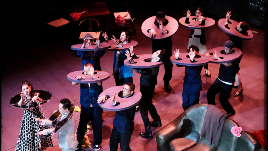 整部戏中演员的表演呈现出类似武侠小说的江湖气,每一个人物都带着自己的欲望出现,每一个人物实现自己目的的招式又各不相同。张弛有度、步步紧逼的巧玲,爱憎分明的瘦马,绵里藏针的牛布(白凯南饰),活在剧中又跳出整部剧的行为艺术灯罩、命运咏叹调的歌者(么红饰),出场时广东话口音后又一口山东方言的黄大师(李龙吟饰)……不同的表演方式、不同的口音,组合成现实生活中五湖四海的生活原貌,表演的生动性汇集在虚实交错而不失真的舞台行动中,让莫言剧本中魔幻、荒诞但不脱离现实主义的特点得到了精准的舞台呈现。