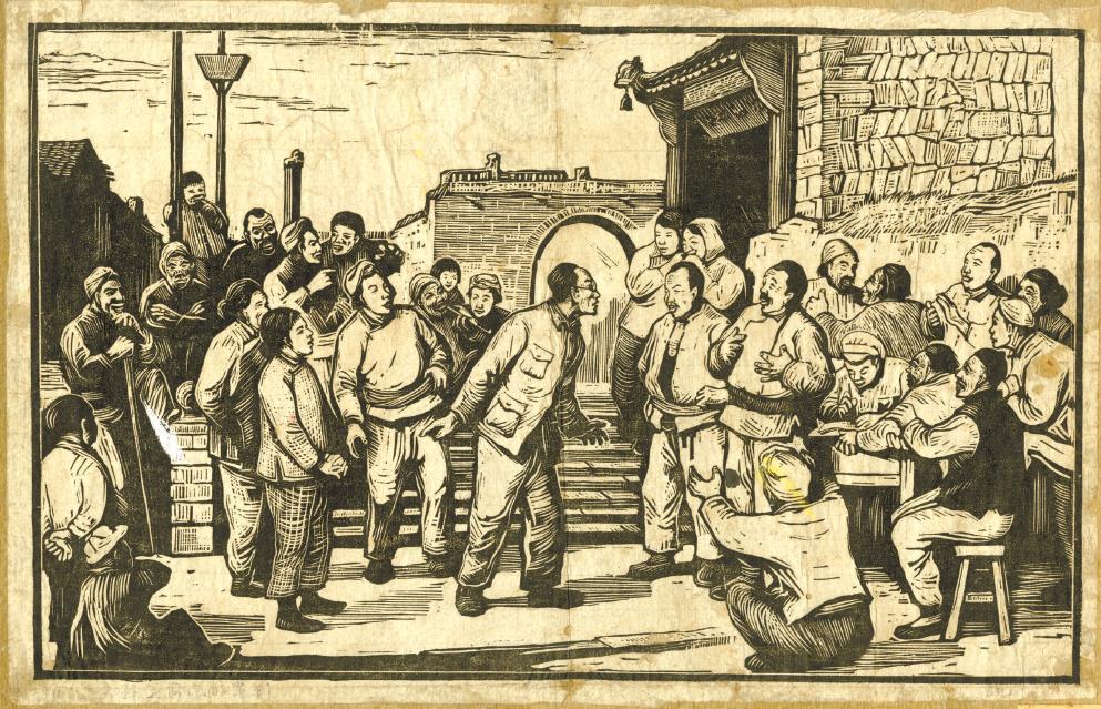 古元《马锡五同志调解婚姻案》黑白木刻(1944年)