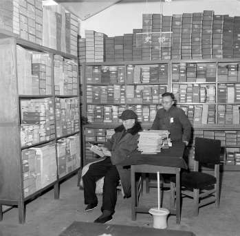 1956年,西北大学历史系教授马长寿(左)在中国书店专家服务部选古书。李祖慧摄