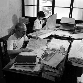 1962年,中国书店古书修补工厂的工作人员在修补古书。高宏摄
