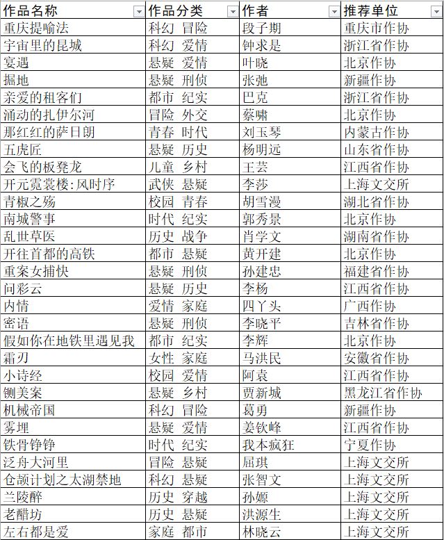 文学是影视的源头活水,在影视改编和创作中发挥着重要的母本作用。此次推介会共推荐《欢迎来到人间》《河山传》《登春台》《北爱》《花灯调》等中国作协“新时代山乡巨变创作计划”和“新时代文学攀登计划”入选作品18部,以及《宇宙里的昆城》《重庆提喻法》《宴遇》《掘地》《亲爱的租客们》等文学转化影视重点推荐作品30部。活动现场,邱华栋、李晓东、马文运、柳建伟、周建东、宁江生、余飞等共同启动文学转化影视重点推荐作品发布仪式。据介绍,推荐作品涵盖历史、悬疑、武侠、科幻、都市、乡土、爱情、纪实等多个题材领域,情感真挚、思想深刻、艺术表现力强,具有很高的艺术价值和社会意义。