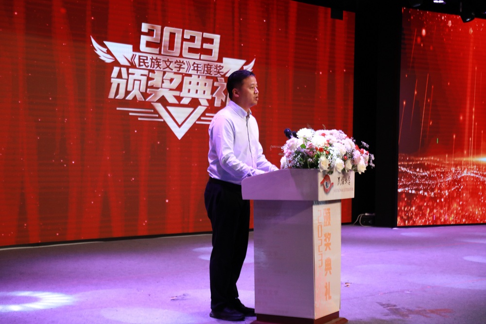 吴学榕代表中共丽江市委对颁奖典礼的举办表示祝贺,对参加典礼的各位嘉宾、作家表示欢迎。他表示,民族文化孕育出民族文学,民族文学又集中展现着民族文化,如同一面镜子,清晰地映照出一个民族的灵魂深处。多民族和谐共融、生生不息造就出的独特民族文化是丽江的“灵魂”,一批又一批的丽江民族文学工作者,始终坚持为人民书写、为时代放歌,创作了许多精品佳作,擦亮了“文化丽江”品牌。《民族文学》年度奖颁奖典礼在丽江的持续举办,必将有力促进丽江民族文学人才培养和优秀作品创作,为丽江文化发展注入持久的原动力。