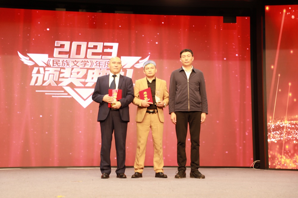 丘树宏、鲁若迪基为《民族文学》汉文版评论奖和新锐奖获奖作家马绍玺、巴燕·塔斯肯颁奖