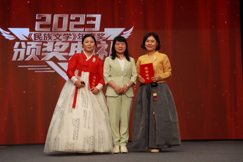 杨玉梅为《民族文学》朝鲜文版获奖作家翻译家李顺花、金海鹰颁奖