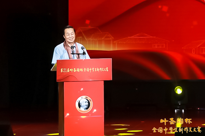 大赛组委会主任、中国当代文学研究会名誉会长、中国社科院研究员白烨在祝贺获奖师生的同时,总结了本届大赛工作,特别对所有支持大赛的单位表达了诚挚的谢意。他说,叶圣陶杯大赛不仅是一个中学生赛事,而且是配合党和国家政策导向,为国育材、培根铸魂、立德树人的重要途径。当前二十届三中全会已经明确擘画了未来二十年中华民族伟大复兴的蓝图,大赛的选手都将成为这个伟大时代的见证者、建设者,应该更加主动地拥抱时代,提升自己的文化综合素养。