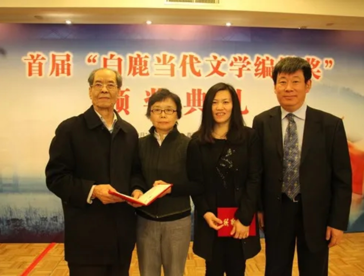 忠实先生对编辑工作十分尊重,对过去在《白鹿原》编辑和出版过程中编辑的努力总是念念不忘。有一年,他提议用他的部分稿费作为基金,与人民文学出版社一起,设立一个“白鹿当代文学编辑奖”,以表彰人民文学出版社在当代文学出版工作中做出突出业绩的编辑,我们当然欣然同意。首届奖项除了设立了“正奖”,还特别设立了“《白鹿原》出版纪念奖”,对每一位在《白鹿原》编辑出版方面有过贡献的编辑一一给予奖励,以表达陈忠实先生对这些无名英雄的感激之情,由此也体现出陈忠实先生的高贵品格。这一举动,在文学出版界,一时传为佳话。这一次,陈忠实先生亲自来京出席了颁奖会,我与忠实先生一起为获“正奖”的两位编辑颁奖,先生的脸上露出真诚的微笑。我与忠实先生还有两位获奖编辑的合影一直珍藏在我的相册里……