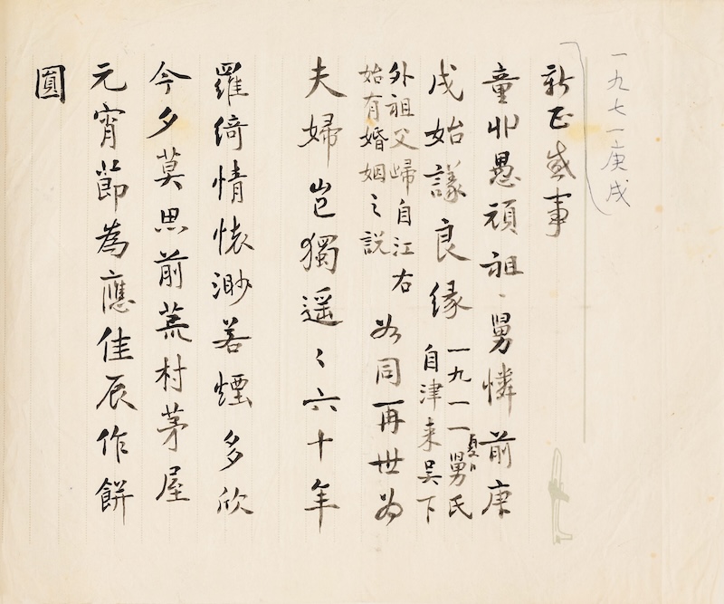 “童儿愚顽祖舅怜,前庚戌始议良缘。为同再世为夫妇,岂独遥遥六十年。”“罗绮情浓渺若烟,多欣今夕莫思前。荒村茅屋元宵节,为应佳辰做饼圆。”