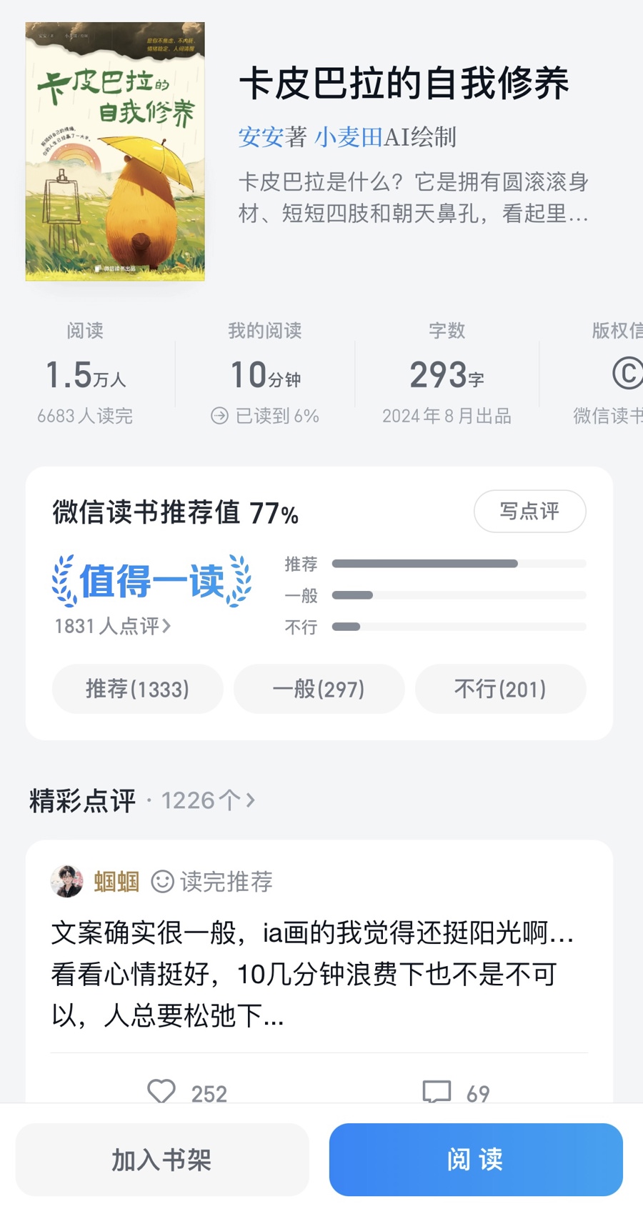 打开微信读书中的《卡皮巴拉的自我修养》,目前显示已有1.5万人阅读,超过6600人读完。这本8月上架的绘本,共293字,简介称“希望通过可爱、松弛的水豚卡皮巴拉,为人们传递繁忙生活中的治愈与温暖”。目前,在推荐栏,认为其值得“推荐”的超过1300,“一般”的不到300,“不行”的评价刚刚超过200。