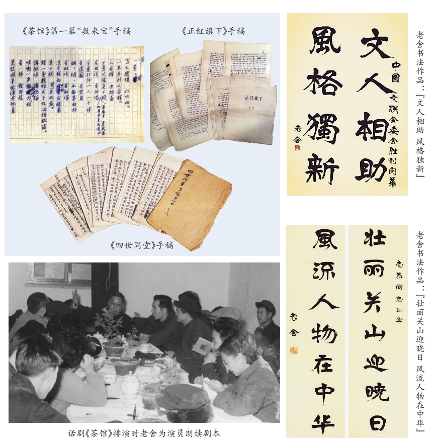 学术界曾对现代文学史上“鲁郭茅巴老曹”的排位有过争论,将老舍定位在文学大师或文学大家之列,毫无异议,只是在具体论述之中,常将“鲁郭茅”置于博大高深,谈及“巴老曹”则偏于特点和个性。作为伟大作家的“巴老曹”,当然也以文学的丰富与复杂垂范后世。1944年,邵力子、郭沫若、沈雁冰、阳翰笙、冯雪峰等发起纪念“老舍创作生活二十年”,在活动“缘起”里,说老舍的文学创作为“新文艺史上划出了一个时代”,成为“新文艺的一座丰碑”“将与中国新文艺日益堂皇而永垂不朽”;还说老舍“无论在做人与做文上,都为我们创作出更多不朽的范本”,而使“新文艺愈加充实光辉”。今天重新读到这些话,仍有莫名的感动和心动。老舍积极投身社会时代变革,以文学创作和文学教育活动等文学行为实现人生价值,展现出精神大境界和文学大格局。
