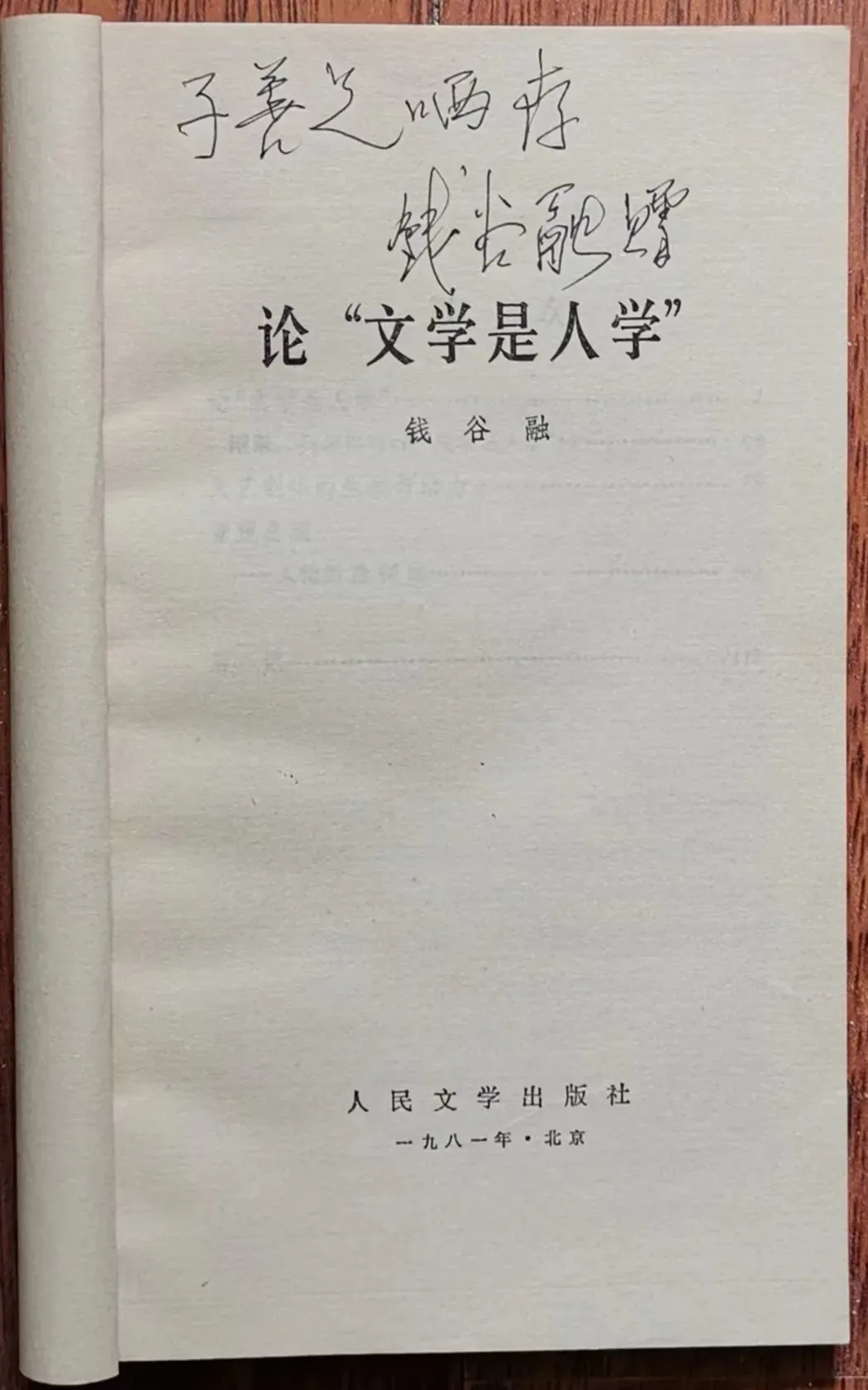 跟随先生从事中国现代文学教研工作那么多年,先生的著作,我几乎每种都有,绝大部分都是他老人家馈赠的。他的第一本书,最薄的一本书,然而也是影响最为深远的一本书,即《论“文学是人学”》(人民文学出版社1981年10月初版),却是我自己买的。正因为书太薄,隐在书堆之中,一时找不到,直到2002年迁入新居,大搬家,方始检出,于是赶快去请先生补签,先生坐在书桌前,大笔一挥:“子善兄哂存 钱谷融赠。”
