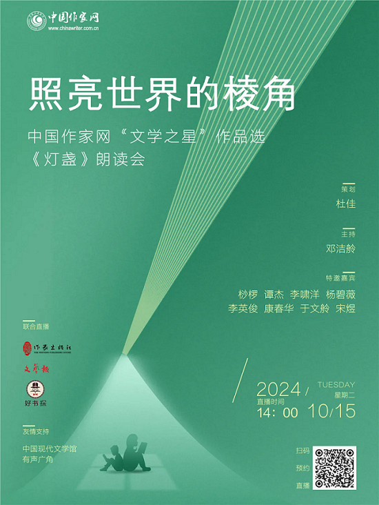 10月15日,中国作家网文学直播间举办了“中国作家网‘文学之星’作品选《灯盏》朗读会”的直播活动。特邀《诗选刊》主编、批评家桫椤,鲁迅文学院教研部副主任谭杰,北京电影学院副教授、青年诗人李啸洋,鲁迅文学院教师、青年诗人杨碧薇,《文艺报》编辑、青年评论家康春华,《当代》文学杂志编辑、青年作家于文舲,《灯盏》作者代表宋煜,以及中国作家网编辑、青年作家李英俊,以“照亮世界的棱角”为主题,结合当下文学热点与具体的文学作品,从选稿与创作、点评与阅读、出版与传播等角度展开交流。活动还邀请有声广角工作室的朗读者朗诵《灯盏》中的部分作品,以声情并茂的朗诵走进文学作品,领略文学魅力。活动由中国作家网编辑邓洁舲主持。