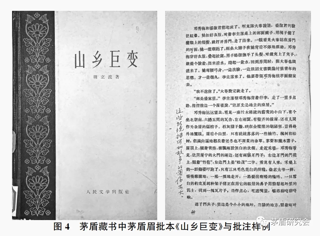 关于周立波《山乡巨变》,在茅盾日记中5次出现,1960年1月8日开始阅读,1月19日阅读完毕,藏书中《山乡巨变》有批注,在《反映社会主义跃进时代,推动社会主义时代的跃进——1960年7月24日在中国文学艺术工作者第三次代表大会上的报告》中单独成段评论《山乡巨变》,在《为实现文化艺术工作的更大更好的跃进而奋斗》(《中国文论·九》,1960年第二届全国人民代表大会第二次会议期间在4月4日大会上的发言,翌日《人民日报》发表)、《谈“人情味”——读 <共产主义的人情味> 偶感》《中国文论·九》,1960年4月笔记)、《反映社会主义跃进时代,推动社会主义时代的跃进——1960年7月24日在中国文学艺术工作者第三次代表大会上的报告》三篇文论中均提及《山乡巨变》。在致萧三(1951年9月18日)与致沙汀(1978年8月2日)书信中提到周立波。 共产主义的人情味>