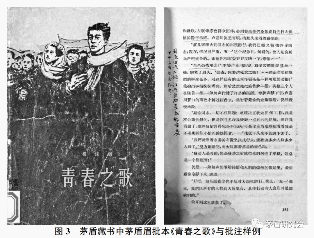 杨沫《青春之歌》,在藏书中《青春之歌》的批注为部分初稿,后继续撰写完成评论文章系《怎样评价 <青春之歌> ?》,刊发于1959年2月16日《中国青年》第四期,是独立成篇的系统评论,在读书杂记(1959年)中,对《青春之歌》进行了评论;在《为实现文化艺术工作的更大更好的跃进而奋斗》(《中国文论·九》,1960年第二届全国人民代表大会第二次会议期间在4月4日大会上的发言,翌日《人民日报》发表)、《反映社会主义跃进时代,推动社会主义时代的跃进——1960年7月24日在中国文学艺术工作者第三次代表大会上的报告》《老兵的希望》《中国文论·十》,1977年11月12日《人民文学》)、《贯彻“双百”方针,砸碎精神枷锁》(《中国文论·十》,1977年11月25日《人民日报》)四篇文论中五次提及《青春之歌》。在致胡锡培(1977年3月8日)书信中表达了对《青春之歌》(长篇小说,杨沫作)再版的关注。 青春之歌>