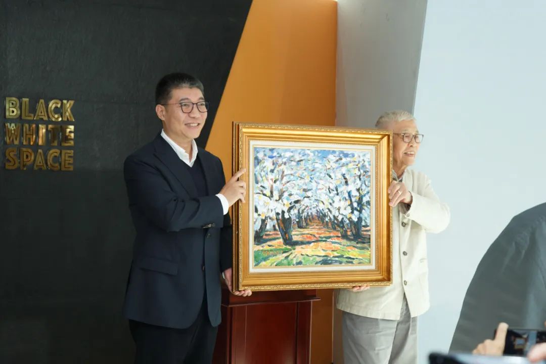 发言仪式后,铁扬先生向母校捐赠画作及十七种画册和文学类书籍。院长郝戎为铁扬先生颁发捐赠证书、佩戴校徽。诸迪宣布展览开幕。随后,全体与会领导、嘉宾到展厅内参观艺术展,并开展交流。