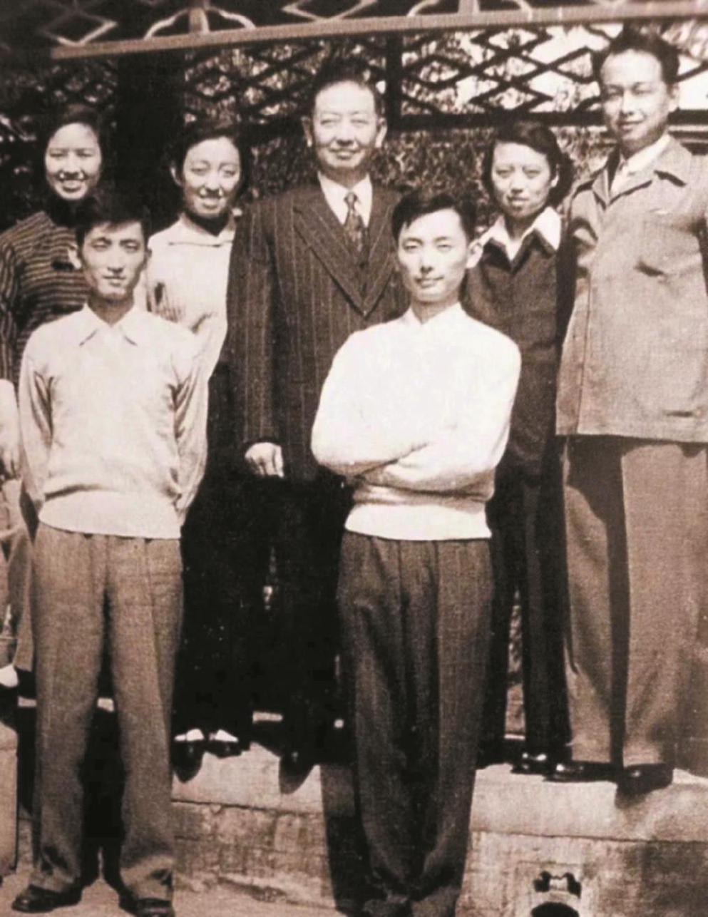 梅兰芳先生与儿子、女儿及儿媳合影。 后排右起:梅葆琛、林映霞夫妇,梅兰芳先生(中),梅葆玥,梅绍武(左前)、屠珍(后排左一)夫妇,梅葆玖(右前)。