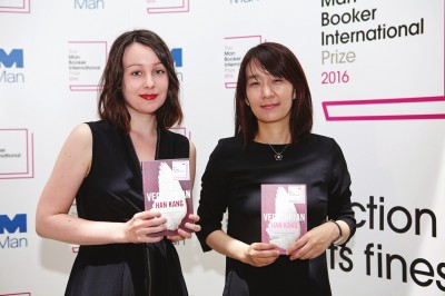 凭着英译小说《素食主义者》,年轻的韩国语翻译家德博拉·史密斯(左)和作家韩江分享了2016年的布克国际奖。贾妮·艾雷摄影,布克奖基金会图片