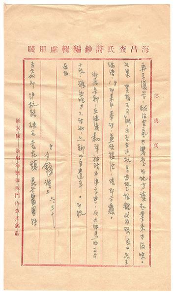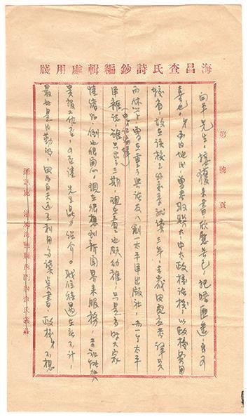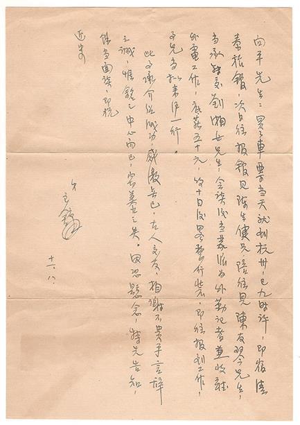 接获来书,欣慰无已,把晤匪遥,良可喜也。弟至内地后,曾考取联大、中大、政校诸校,以政校费用较省,故在该校之外交系就读三年,去岁因应考译员而休学,曾在重庆与诸友人创一太平洋出版社,办一个太平洋杂志(由弟任编辑),虽只出了三期,现在看看也颇幼稚,只是当时大家情绪好,倒也很开心。现在很想到新闻界来服务,未知能加入贵报工作否,可否请先生鼎力绍介。职位待遇在所不计,最好是内勤的,因为白天还有利用多读点书,政校弟不想再去复学,政治空气太浓厚的地方读起书来太没味。如果贵报不可能,可否在沪、杭、京等地之报馆代为设法。如有端绪,弟即来沪奉访,兼便接洽,请即示复。