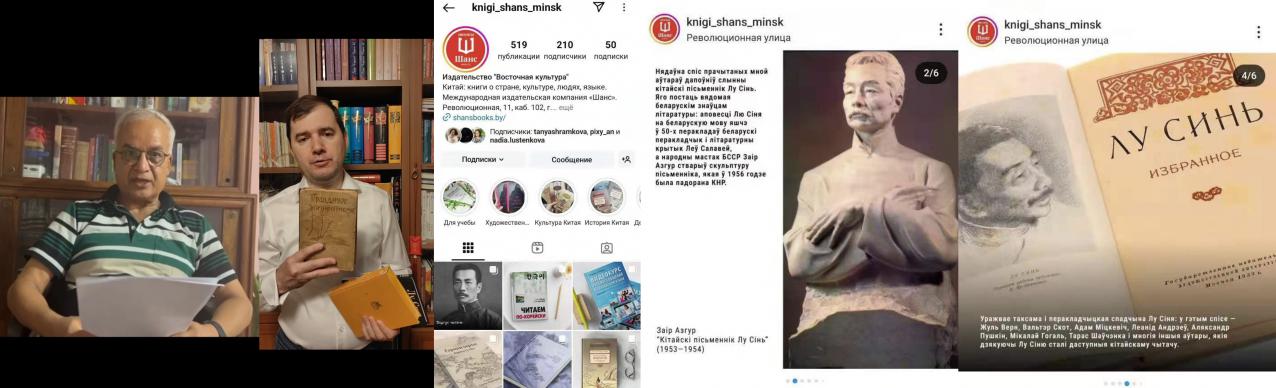 海外读者反馈部分照片,其中左二是俄罗斯汉学家罗季奥诺夫展示的1929年出版的俄文版鲁迅作品,右二是白俄罗斯艺术家扎伊尔·阿兹古尔制作的鲁迅雕像