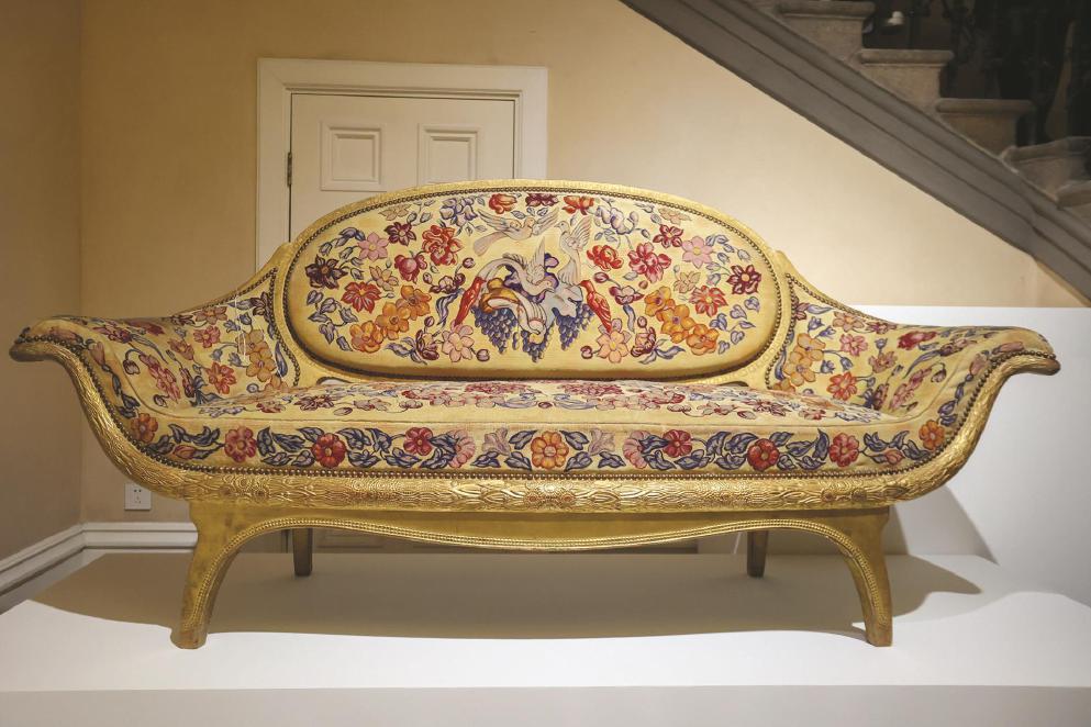 从大木箱中缓缓移出的一件金色欧式扶手椅,是其中一件,鎏金榉木材质,包裹着丝绒面料,呈现出繁复的装饰图案,拉满“泼天的富贵”感。这是法国国家家具管理馆珍藏的“金鸟”系列家具之一,曾华美亮相1925年举办的巴黎国际装饰艺术与现代工业博览会,集两位艺术家的智慧结晶于一体。其木构造型,由法国装饰艺术家、室内设计大师阿尔芒-阿尔贝·拉托完成,结合新古典主义元素与现代构型,日后它也成为最具代表性的家具构型之一。而其织锦部分,则由深受“纳比派”和“野兽派”影响的法国画家勒内·皮奥绘制,由创立于1664年、曾为皇家挂毯织造机构的博韦挂毯厂完成织造。在此次展览中,观众不仅能见到这件“金鸟”系列的扶手椅,还将邂逅该系列的屏风和两把扶手椅。